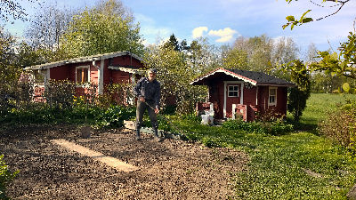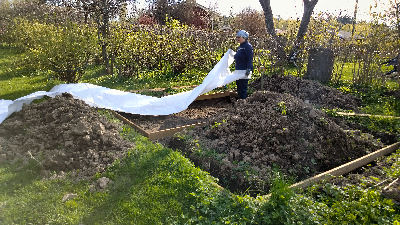 (Kuvat yllä) Siirtolapuutarhamökillämme, Palmurannassa, teimme keväällä puutarhamaan perusparannuksen: eristyskangas perunapellon alle.