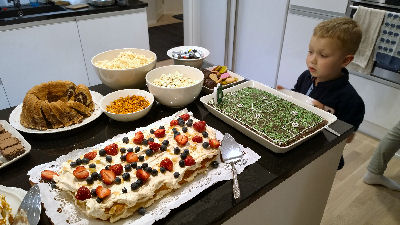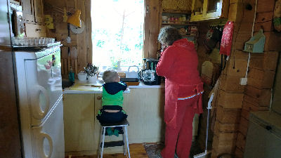 (Kuvat alimpana) Tampereen pojanpojat olivat vierainamme kesäkuun lopulla. Kuopus halusi auttaa Annukka-mummoa keittiössä,