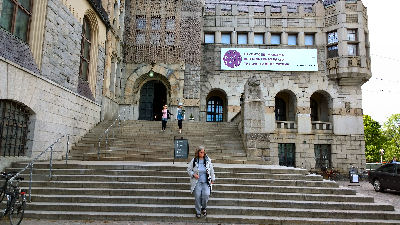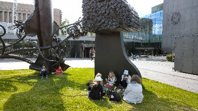 (Kuvat yllä) Leiriltä tehtiin myös retki Helsinkiin, Kansallismuseoon. Eväät syötiin Musiikkitalon edustan taideteoksen alla.