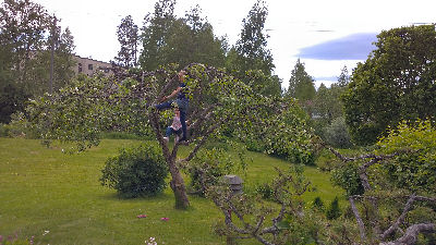 (Kuvat alla) Ryttylässä tytöt saivat kiipeillä Lea-mummon pihan omenapuussa.