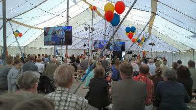 Juhlia vietettiin teltassa Kauniaisten raamattuopiston pihapiirissä.
