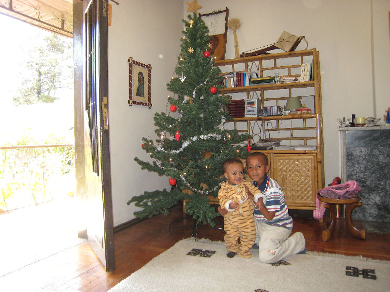 Joulusaunan joulukuusen (oman pihan sypressinoksan) koristeli vierastalon etiopialainen emäntä. |