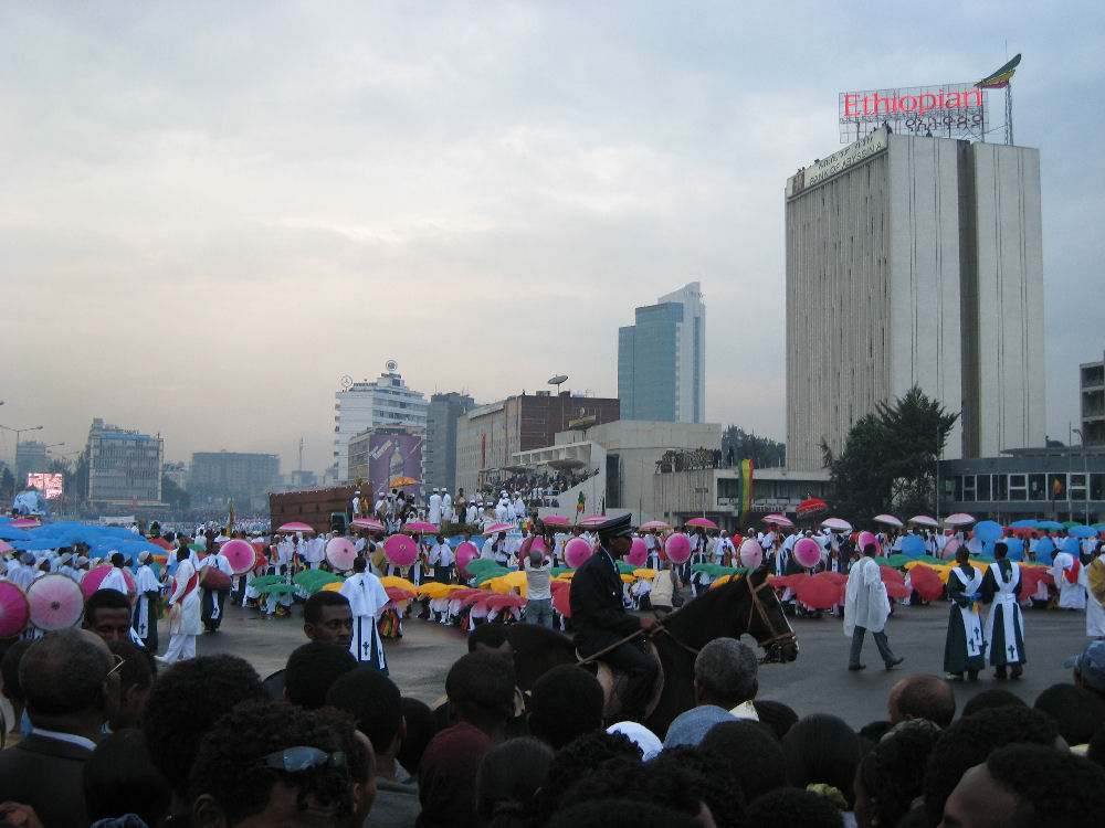 Mekane Yesus -kirkon ulosvuokrattu keskusvirastorakennus on koristeltu koreasti toivottamaan Millennium-vieraat tervetulleiksi. |