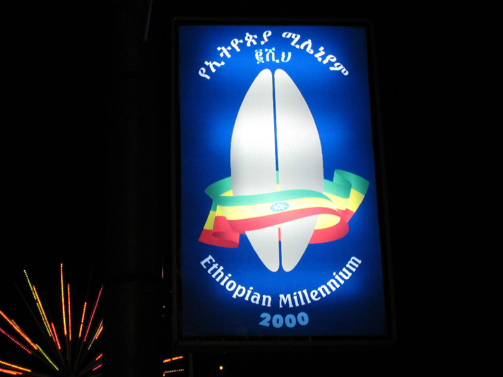 Millennium-näyttelyssä on vuosiluku 2000 kirjoitettuna ensin amharaksi (luku 2 ja sana "tuhat" ja sitten täälläkin yleisesti käytetyin arabialaisin numeroin. |